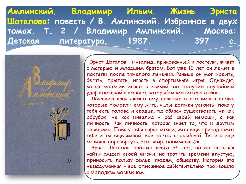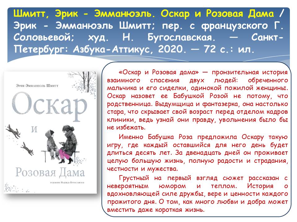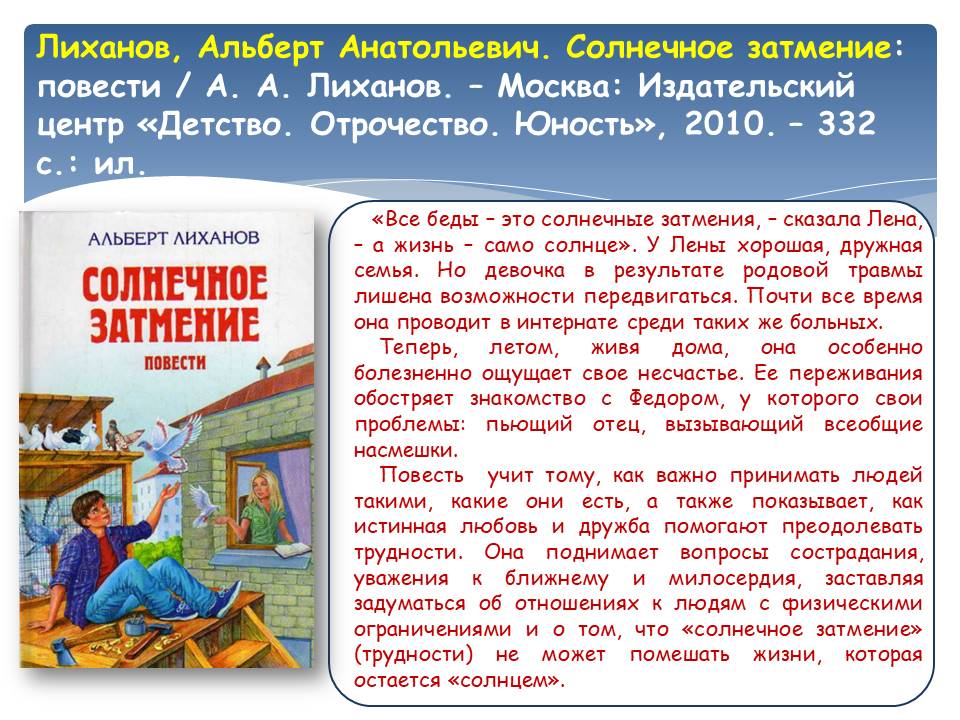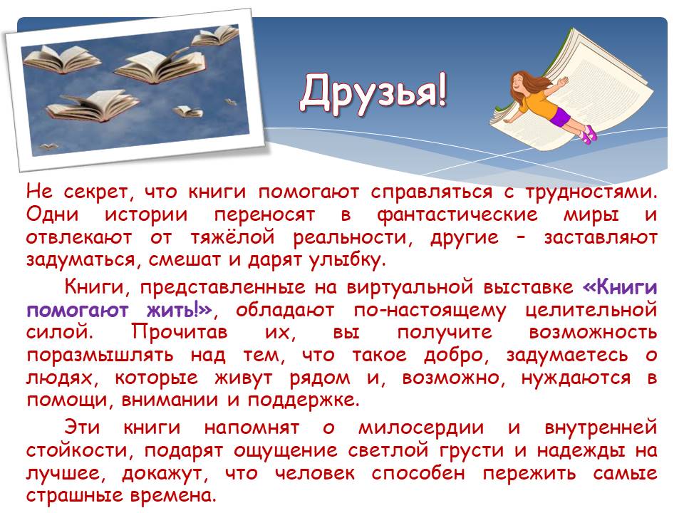 Не секрет, что книги помогают справляться с трудностями. Одни истории переносят в фантастические миры и отвлекают от тяжёлой реальности, другие – заставляют задуматься, смешат и дарят улыбку. Книги, представленные на виртуальной выставке «Книги помогают жить!», обладают по-настоящему целительной силой. Прочитав их, вы получите возможность поразмышлять над тем, что такое добро, задумаетесь о людях, которые живут рядом и, возможно, нуждаются в помощи, внимании и поддержке. Эти книги напомнят о милосердии и внутренней стойкости, подарят ощущение светлой грусти и надежды на лучшее, докажут, что человек способен пережить самые страшные времена.