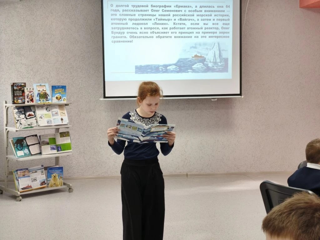 В формате громких чтений школьники прочитали главы из книги и узнали, что начало всему положил российский судовладелец самоучка Михаил Бритнев, который придумал корабль, способный прокладывать себе путь среди льда.