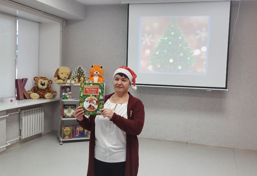 Вначале встречи библиотекарь, взяв за основу книгу Ольги Дворниковой «История новогодних игрушек», рассказала об истории возникновения новогодних игрушек.