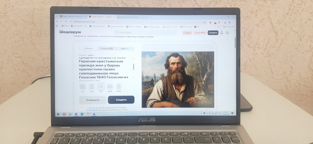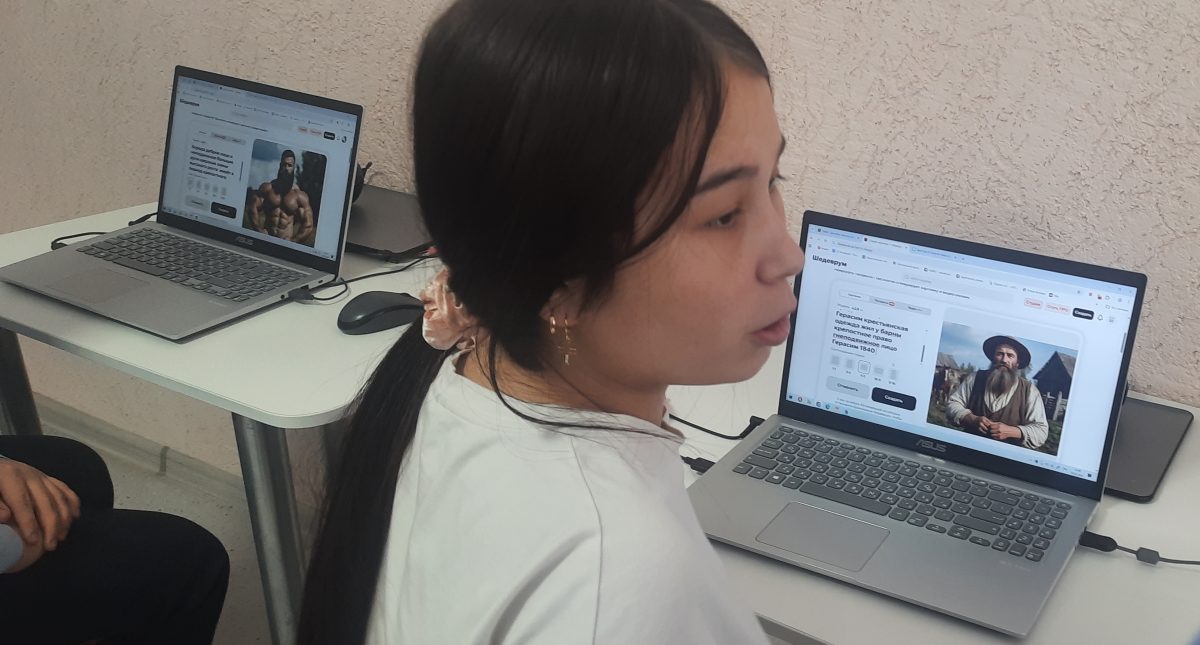 Библиотекарь подготовила для подростков выставку книг изданий разных лет рассказа «Му-му» И. Тургенева. Юные читатели имели возможность ознакомиться с иллюстрациями, созданными различными художниками. После детального обсуждения образа и особенностей внешности героя ребята сформулировали четкий промт — инструкцию для программы «Шедеврум», которая помогла изобразить именно тот портретный образ, который представлялся каждому участнику мастер-класса. Это показало, насколько важно умение формулировать свои желания и мысли ясно и точно, особенно в условиях взаимодействия с цифровыми инструментами.