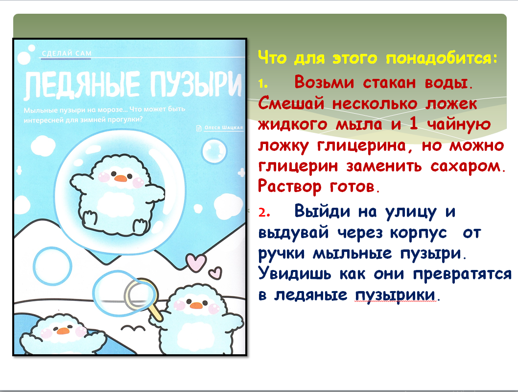Особенное впечатление на детей произвела рубрика «Сделай сам», где были представлены интересные эксперименты и практические советы. Среди множества идей, таких как: создание хлопушек из пакета, калейдоскопа из пластиковых крышек из-под йогурта особенно выделился необычный зимний эксперимент — замораживание мыльных пузырей на улице зимой. А если добавить в мыльный раствор глицерин, то можно увидеть образование уникальных ледяных узоров внутри пузырьков. Этот эксперимент может быть и увлекательной игрой, и захватывающим научным наблюдением, доступным зимой каждому ребёнку.