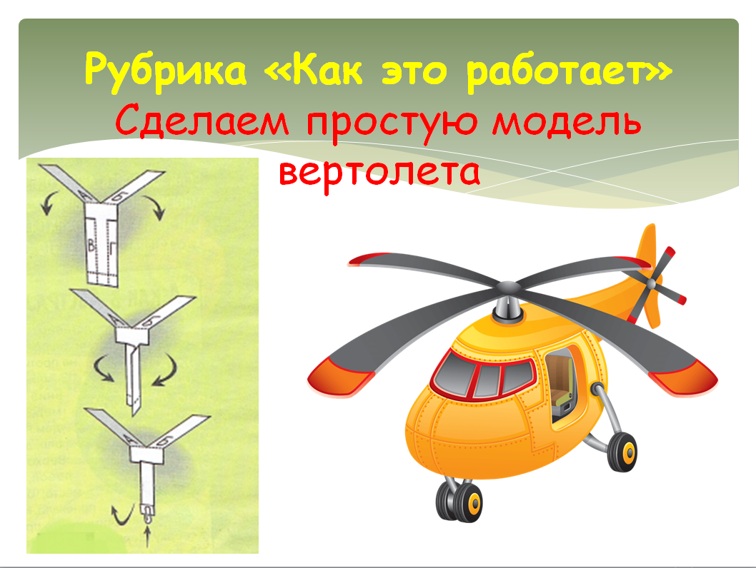 Вызвал интерес ребят и научно-популярный журнал «Вот!» — настоящий кладезь знаний для пытливых умов. Дети, отвечая на вопросы квиза «Что за слово?» попробовали угадать значения слов: чехонаститься, укрякаться, укропать, забобоны, телелякать, ерундопель. Рубрика «Обо всём на свете» доступно объяснила юным участникам мероприятия загадку: почему же желудок остаётся целым и невредимым, несмотря на присутствие в нём соляной кислоты, способной растворять металлы. Четвероклассники узнали массу интересных подробностей о появлении первых вертолетов и смогли самостоятельно сделать свою первую простую модель винтокрылого аппарата. Каждый почувствовал себя авиаконструктором, собирая собственную версию знаменитого воздушного судна.
