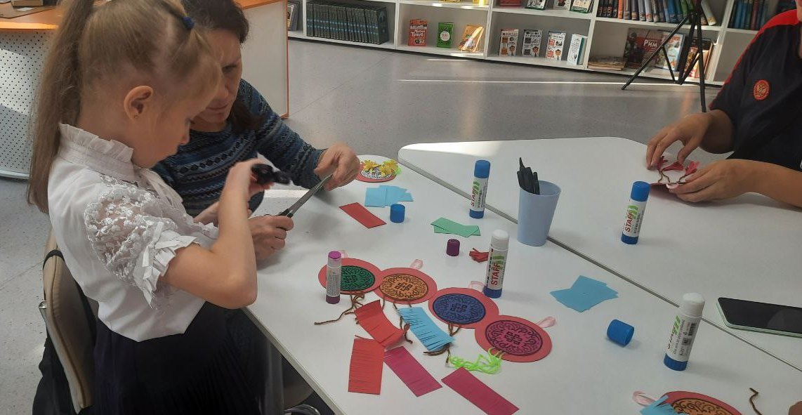 Затем библиотекарь предложила перейти в другой зал на мастер-класс по изготовлению бурятского оберега.